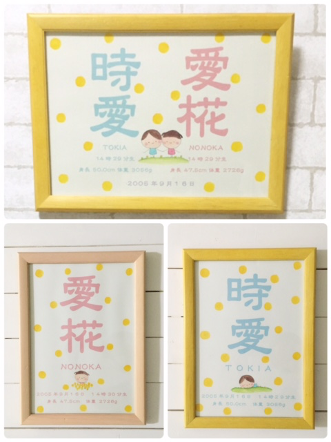 kkworld-kumiが作成する命名表は、男の子は水色、女の子はピンクのやさしい色でお名前を表記し、かわいいオリジナルのイラストを添えるかわいい命名表です。